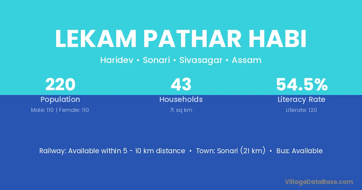 Sonari (21 km) is the nearest town to Lekam Pathar Habi village for major economic activities and is located approximately 21 km away.