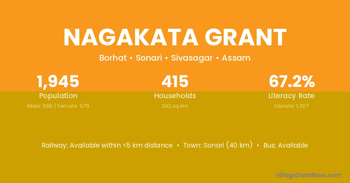 Sonari (40 km) is the nearest town to Nagakata Grant village for major economic activities and is located approximately 40 km away.