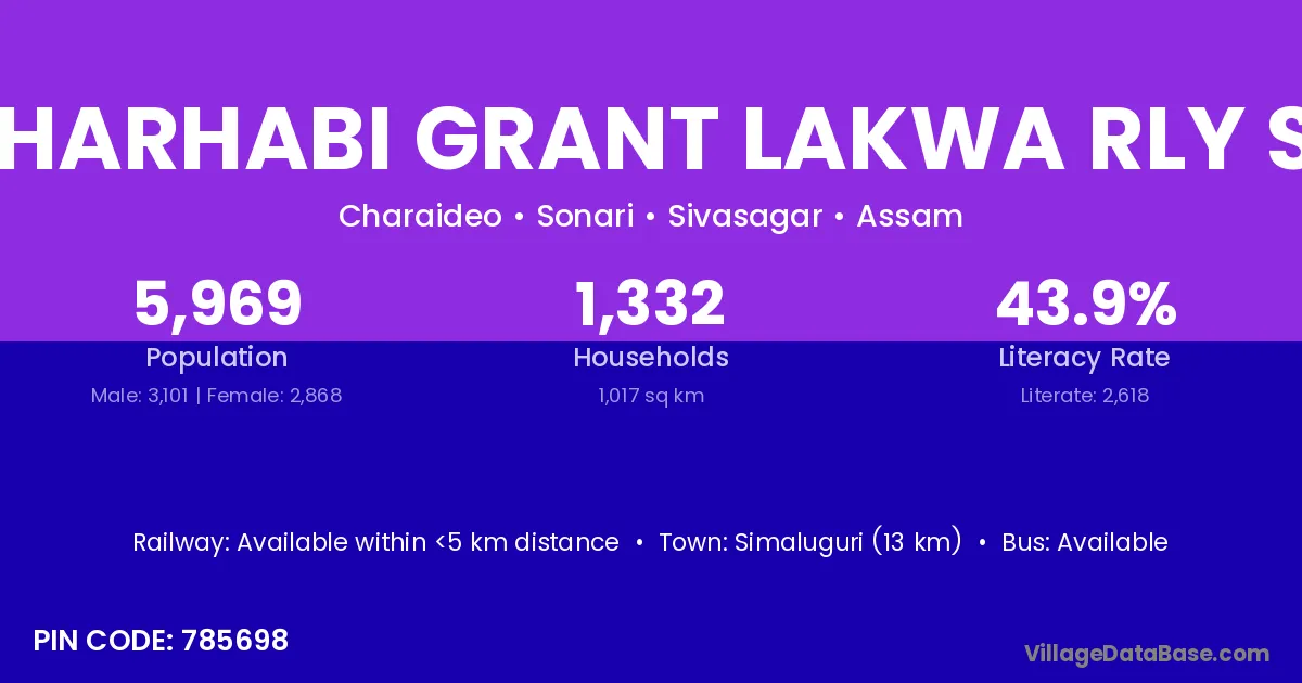 Naharhabi Grant Lakwa Rly Stn village has a total population of 5,969 people, of which 3,101 are males and 2,868 are females.