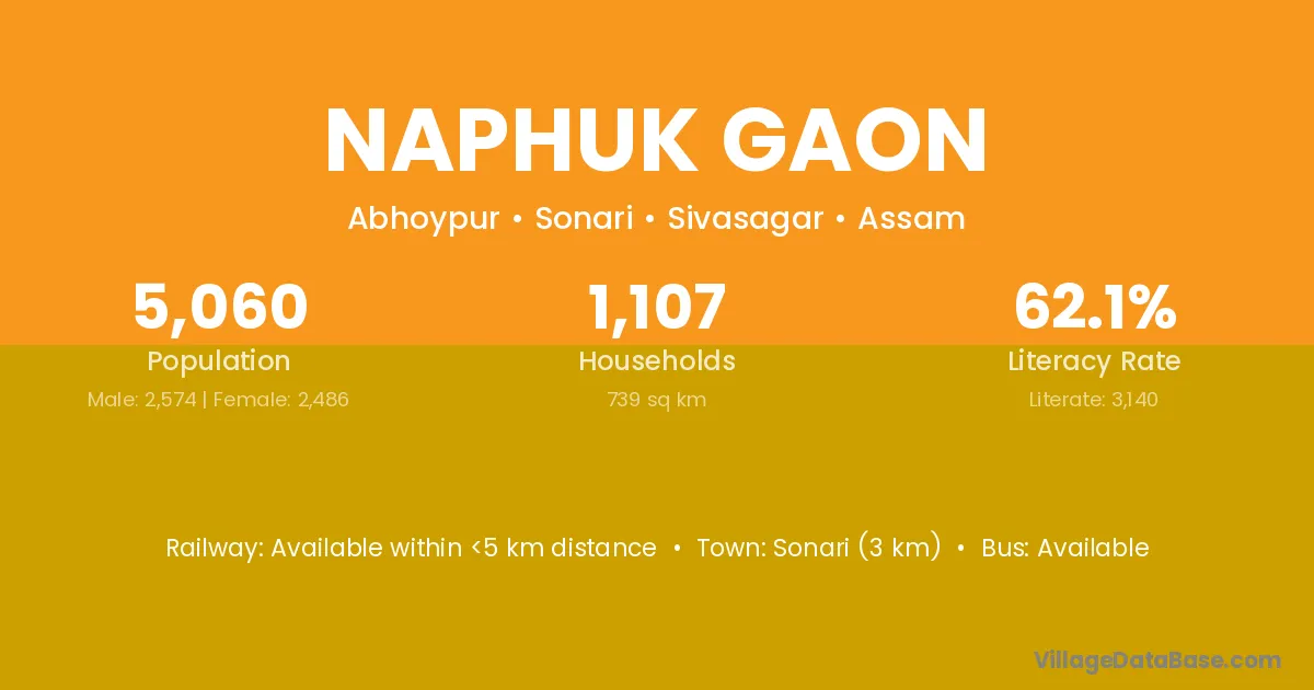 Sonari (3 km) is the nearest town to Naphuk Gaon village for major economic activities and is located approximately 3 km away.