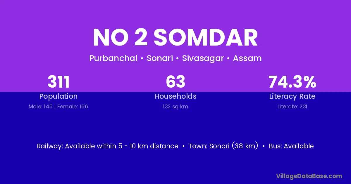 Sonari (38 km) is the nearest town to No 2 Somdar village for major economic activities and is located approximately 38 km away.