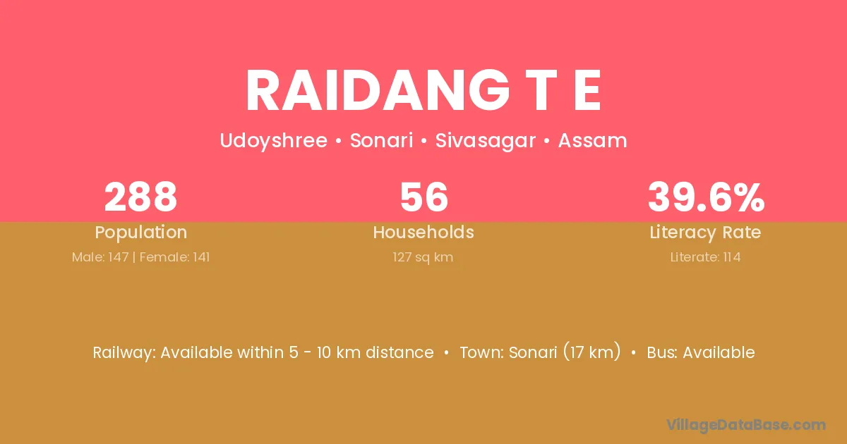 Sonari (17 km) is the nearest town to Raidang T E village for major economic activities and is located approximately 17 km away.