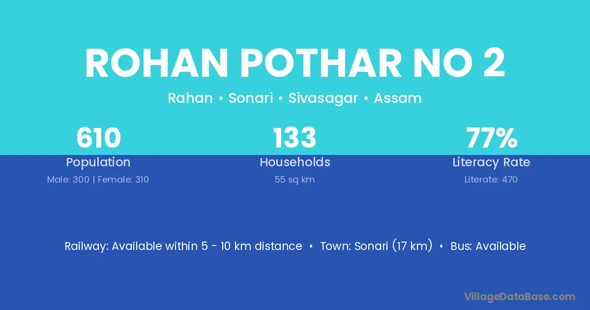 Sonari (17 km) is the nearest town to Rohan Pothar No 2 village for major economic activities and is located approximately 17 km away.