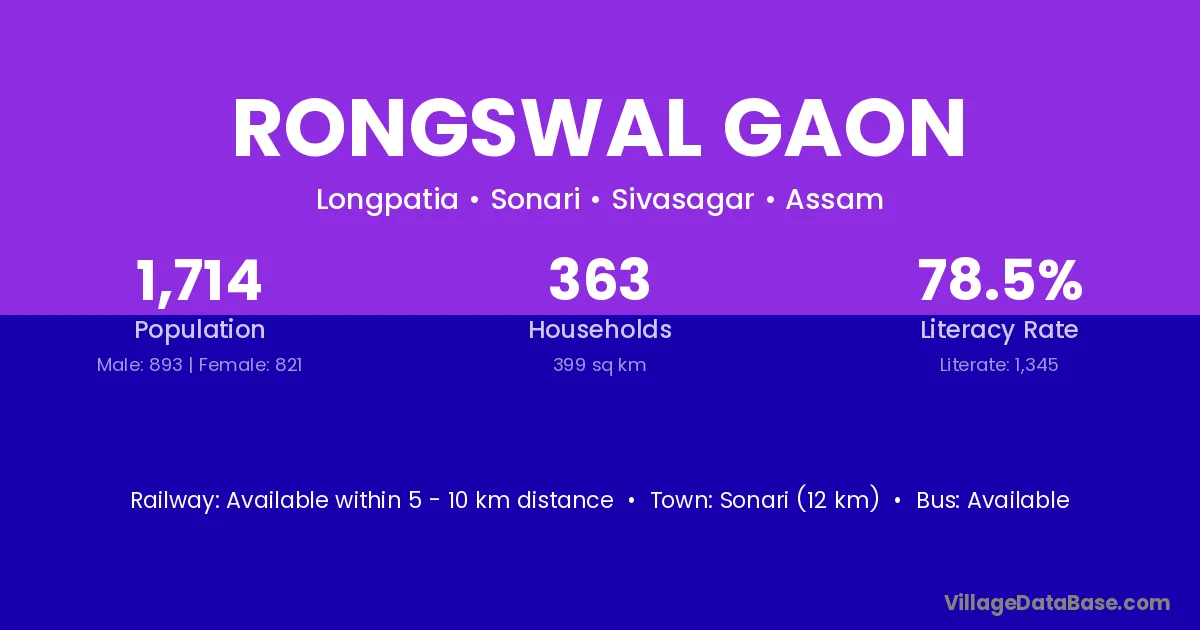 Sonari (12 km) is the nearest town to Rongswal Gaon village for major economic activities and is located approximately 12 km away.