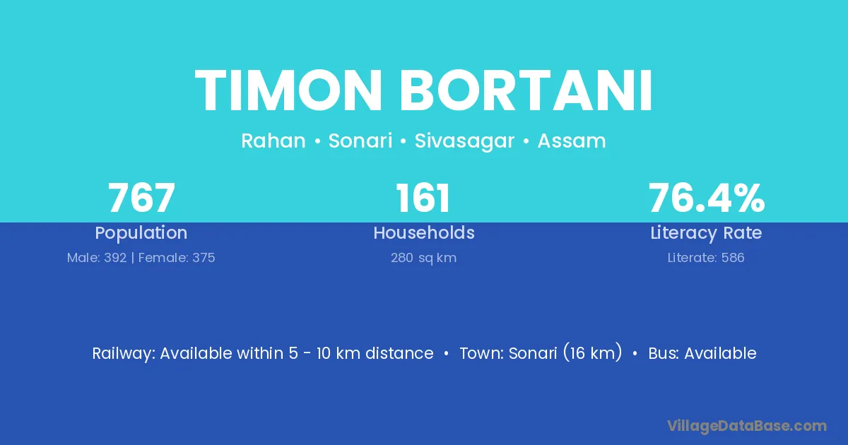 Sonari (16 km) is the nearest town to Timon Bortani village for major economic activities and is located approximately 16 km away.