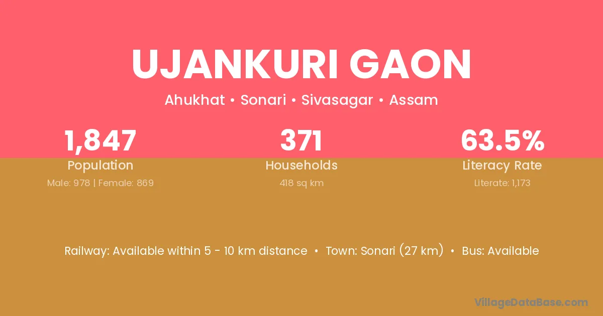 Sonari (27 km) is the nearest town to Ujankuri Gaon village for major economic activities and is located approximately 27 km away.
