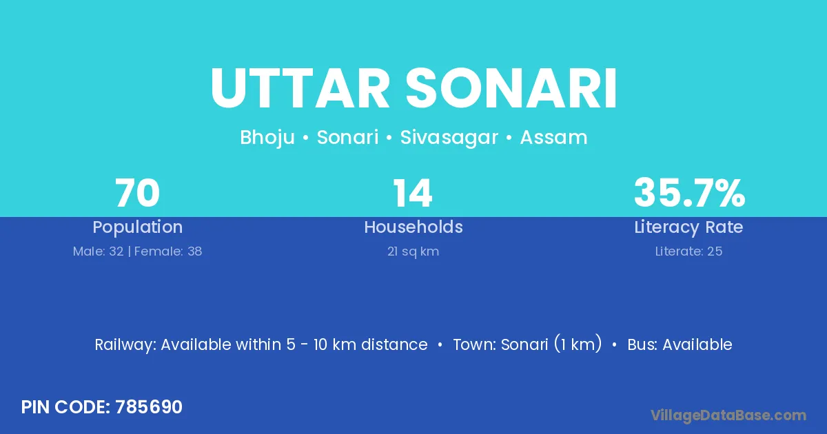 Sonari (1 km) is the nearest town to Uttar Sonari village for major economic activities and is located approximately 1 km away.