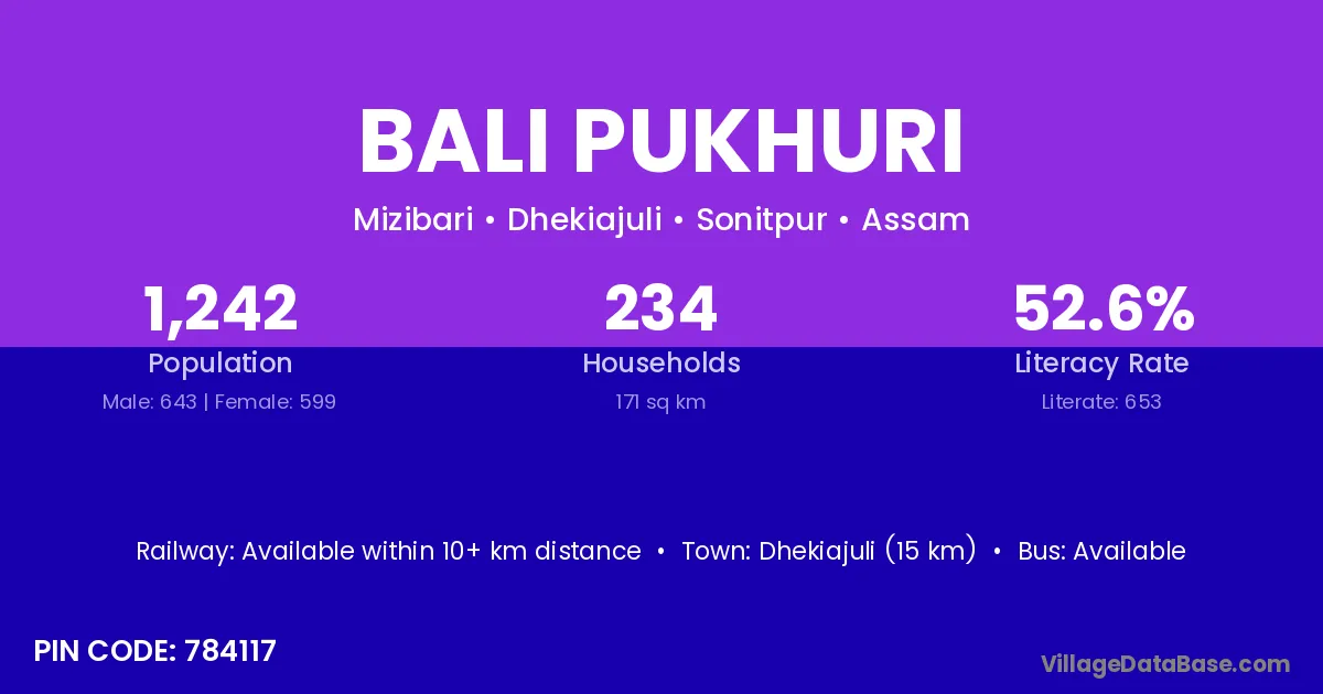 Bali Pukhuri village has a total population of 2,428 people, of which 1,220 are males and 1,208 are females.