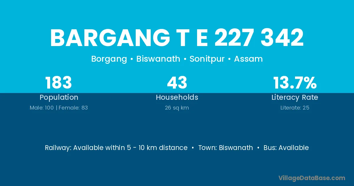 Bargang T E 227 342 village has a total population of 183 people, of which 100 are males and 83 are females.
