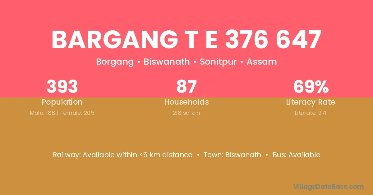 Bargang T E 376 647 village has a total population of 393 people, of which 188 are males and 205 are females.