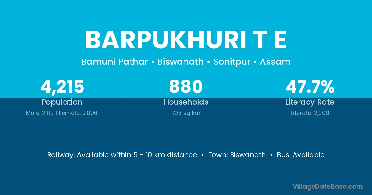 Barpukhuri T E village has a total population of 4,215 people, of which 2,119 are males and 2,096 are females.