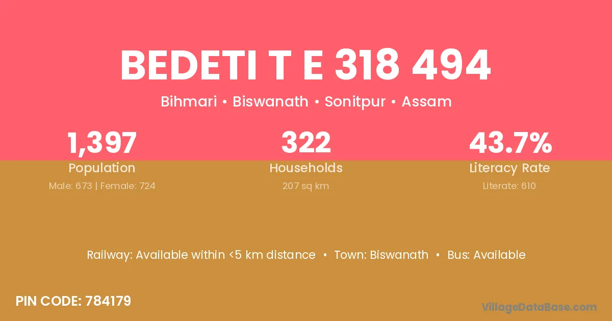 The literacy rate of Bedeti T E 318 494 village is 43.66%. Male literacy stands at 49.03% and female literacy at 38.67%.