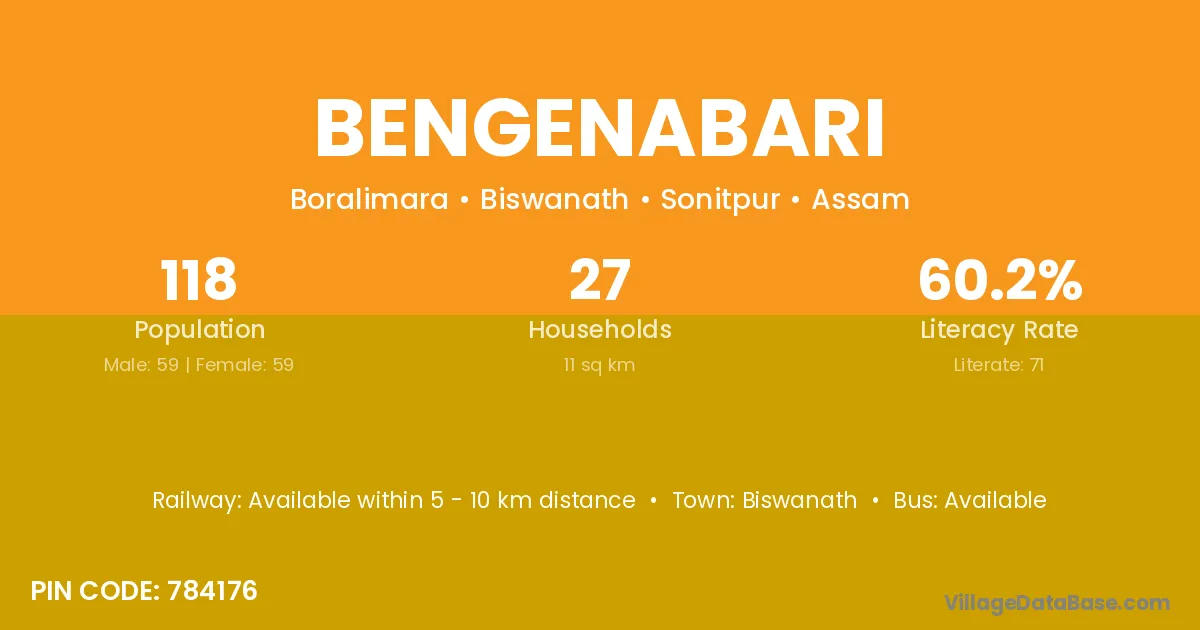 Bengenabari village has a total population of 118 people, of which 59 are males and 59 are females.