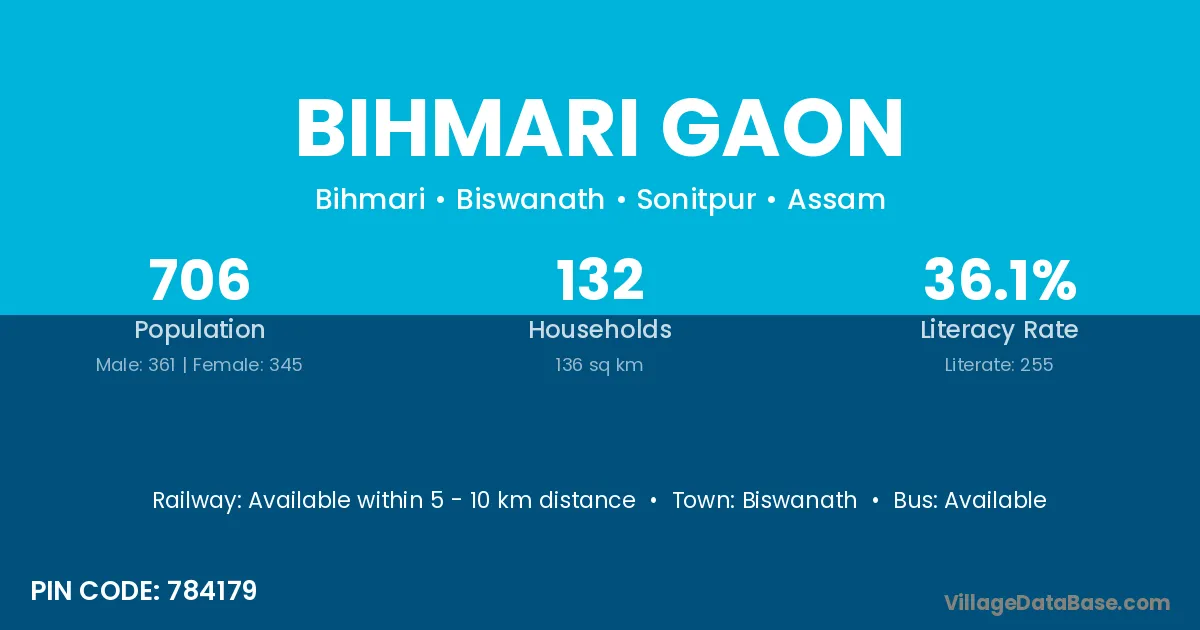 Bihmari Gaon village has a total population of 706 people, of which 361 are males and 345 are females.