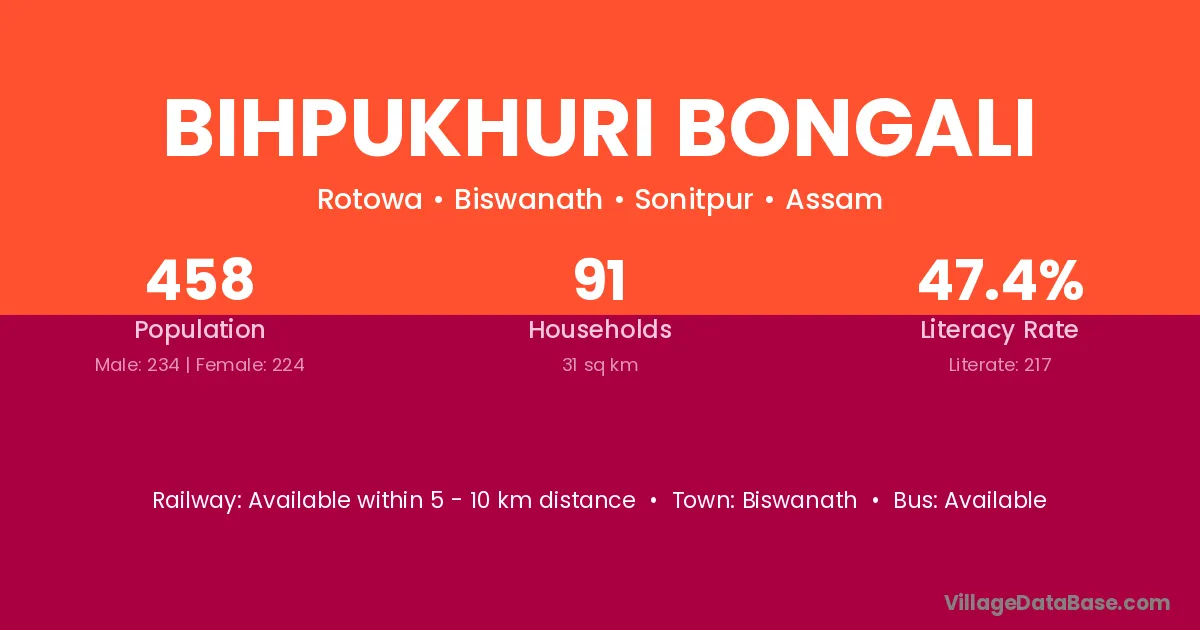 Bihpukhuri Bongali village has a total population of 458 people, of which 234 are males and 224 are females.