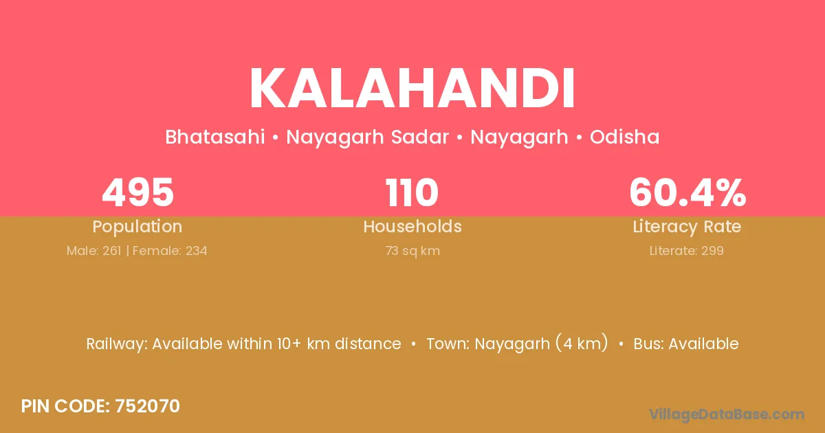 The literacy rate of Kalahandi village is 59.76%. Male literacy stands at 64.80% and female literacy at 54.36%.