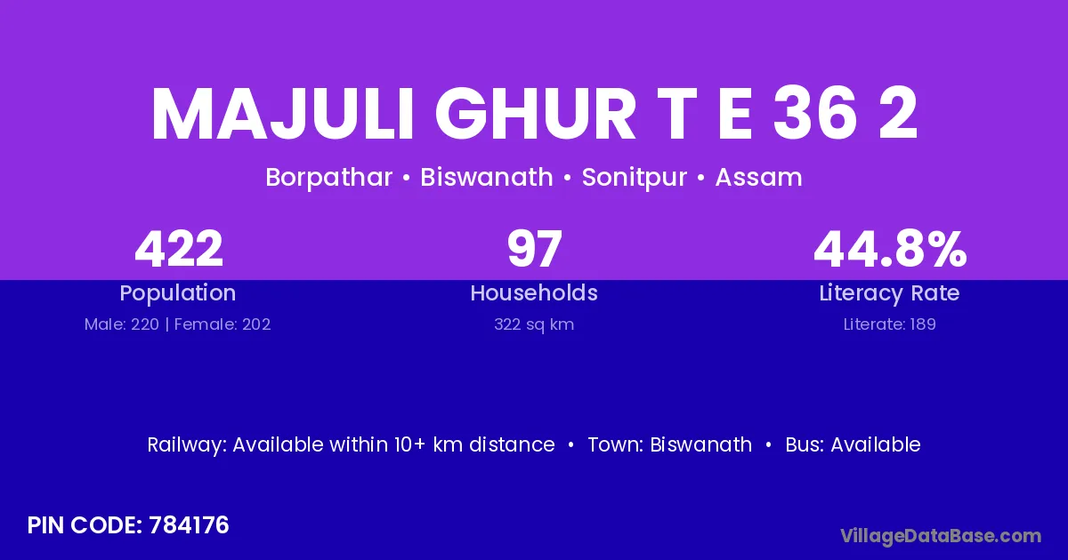 Majuli Ghur T E 36 2 village has a total population of 422 people, of which 220 are males and 202 are females.