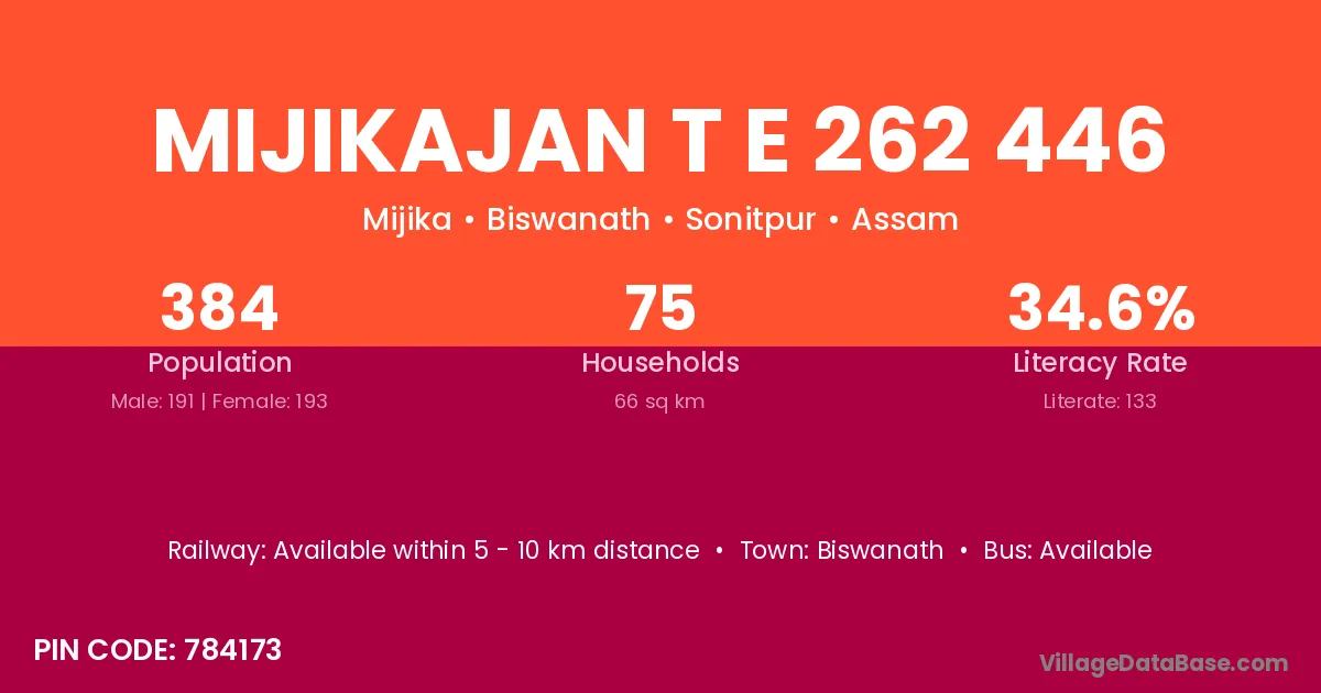 Biswanath is the nearest town to Mijikajan T E 262 446 village for major economic activities