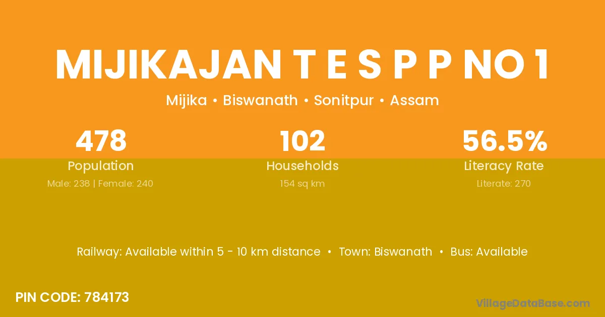 Mijikajan T E S P P No 1 village has a total population of 478 people, of which 238 are males and 240 are females.
