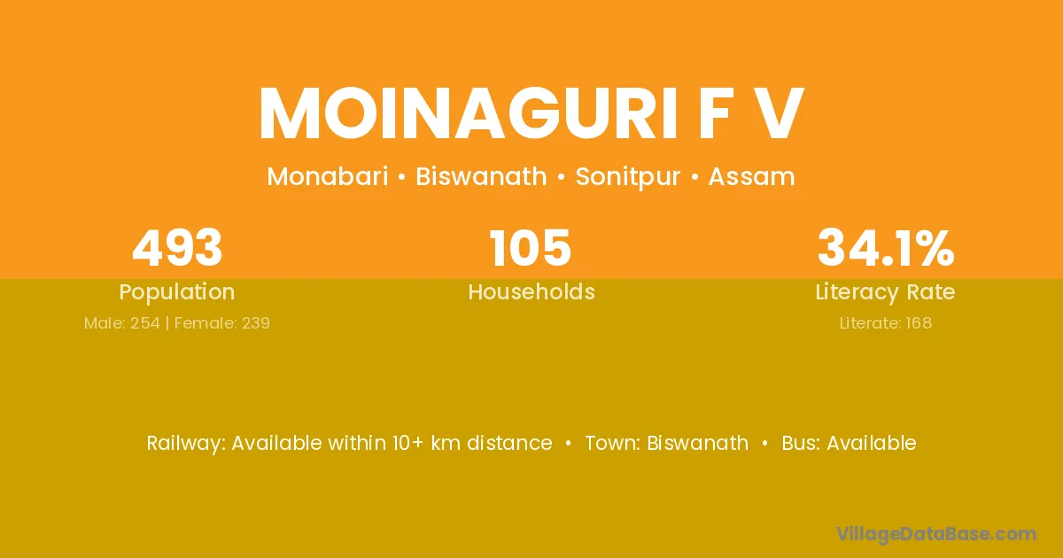 Moinaguri F V village has a total population of 493 people, of which 254 are males and 239 are females.