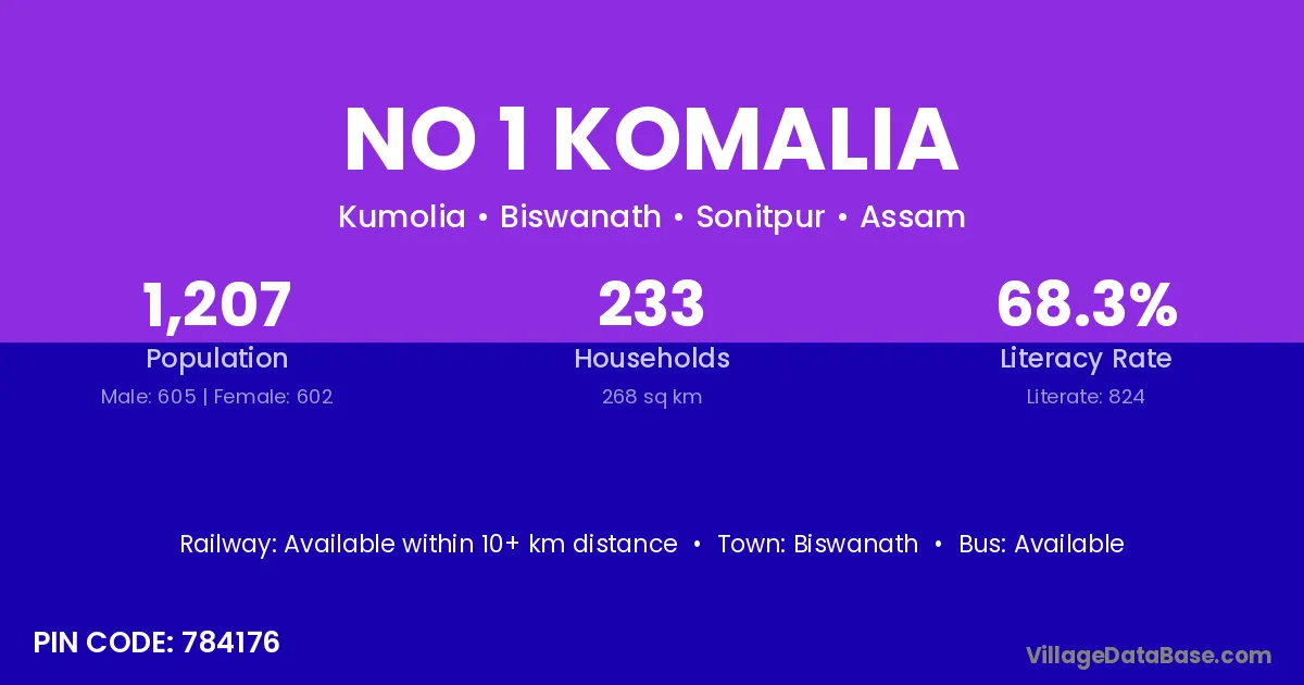 No 1 Komalia village has a total population of 1,207 people, of which 605 are males and 602 are females.