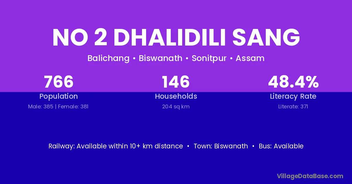 No 2 Dhalidili Sang village has a total population of 766 people, of which 385 are males and 381 are females.