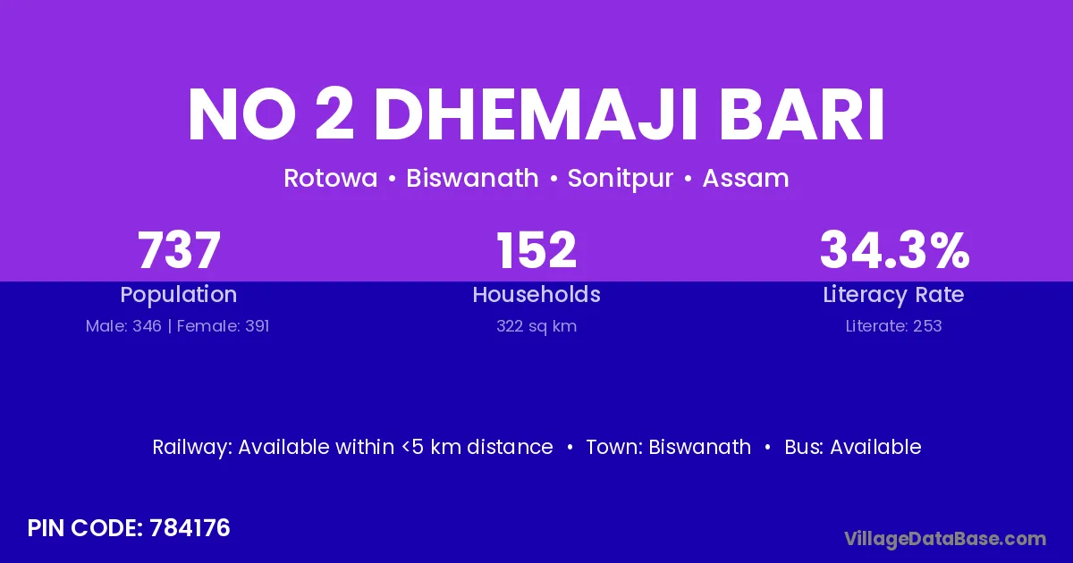 No 2 Dhemaji Bari village has a total population of 737 people, of which 346 are males and 391 are females.