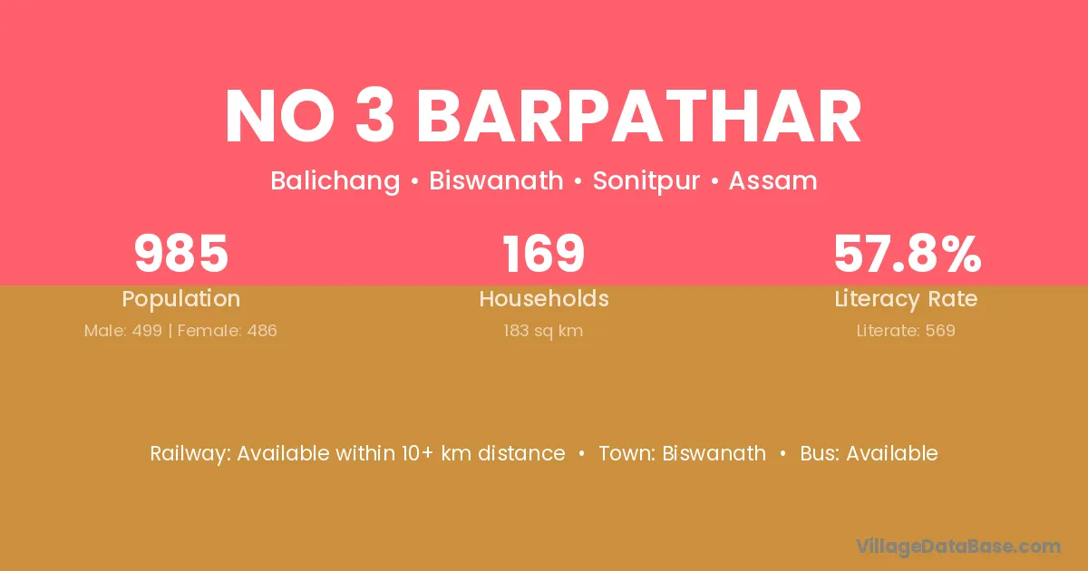 No 3 Barpathar village has a total population of 985 people, of which 499 are males and 486 are females.