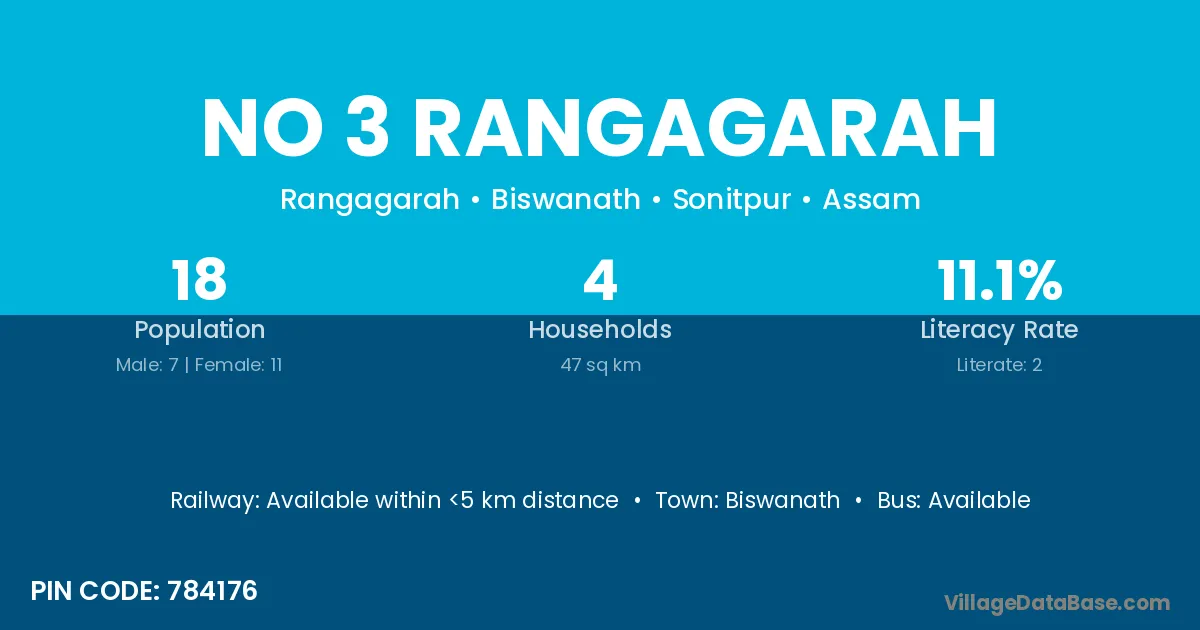 No 3 Rangagarah village has a total population of 18 people, of which 7 are males and 11 are females.