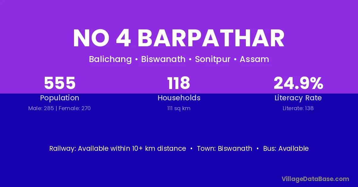 No 4 Barpathar village has a total population of 555 people, of which 285 are males and 270 are females.