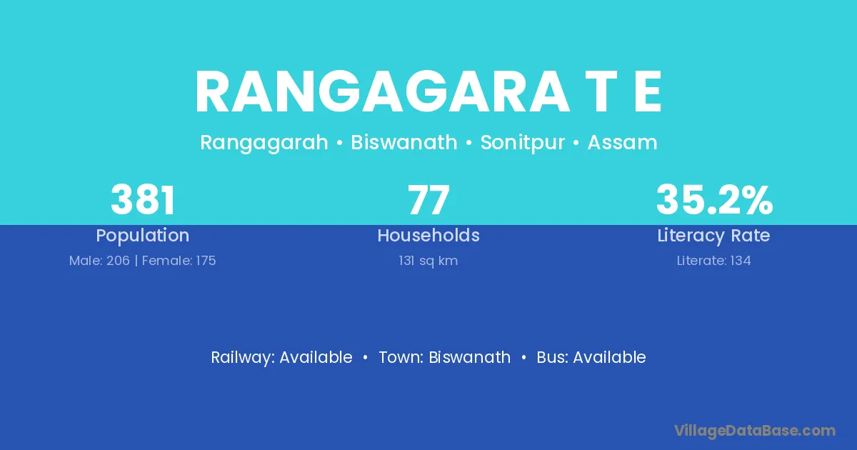 Rangagara T E village has a total population of 381 people, of which 206 are males and 175 are females.