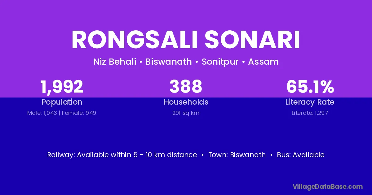 Rongsali Sonari village has a total population of 1,992 people, of which 1,043 are males and 949 are females.