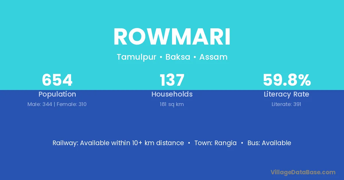 The literacy rate of Rowmari village is 71.43%. Male literacy stands at 76.79% and female literacy at 65.78%.