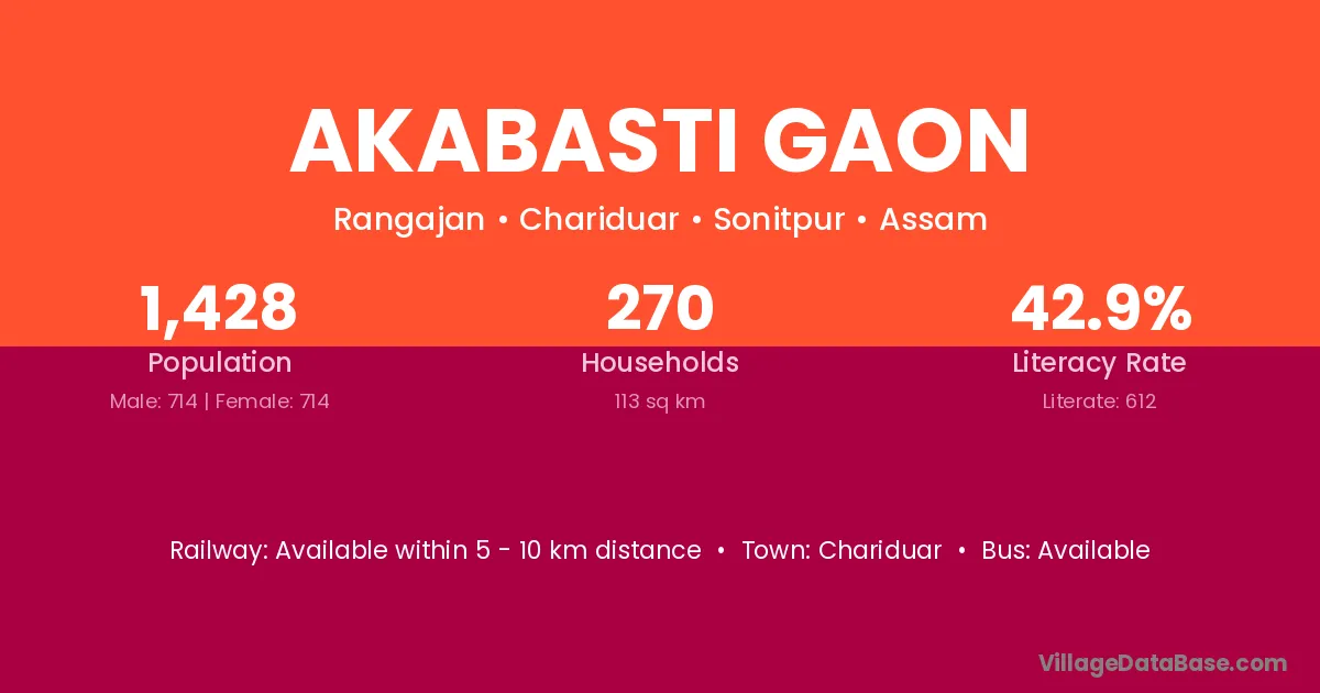 Akabasti Gaon village has a total population of 1,428 people, of which 714 are males and 714 are females.