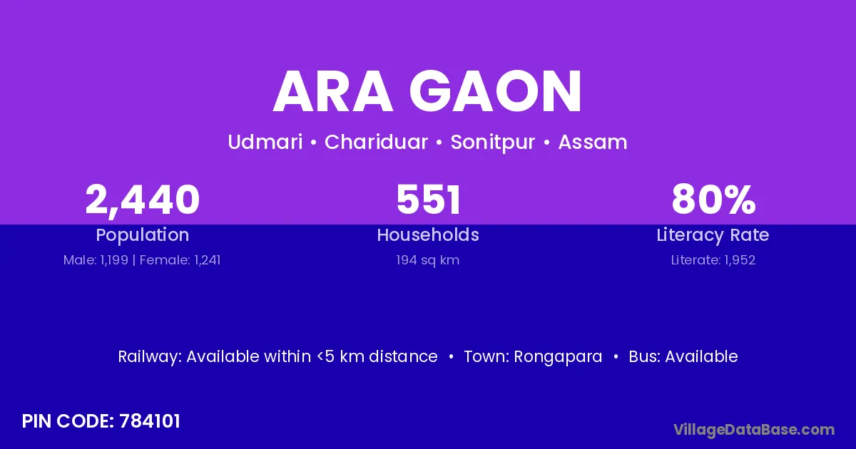 According to Census 2011 information, the village code of Ara Gaon village is 784101.