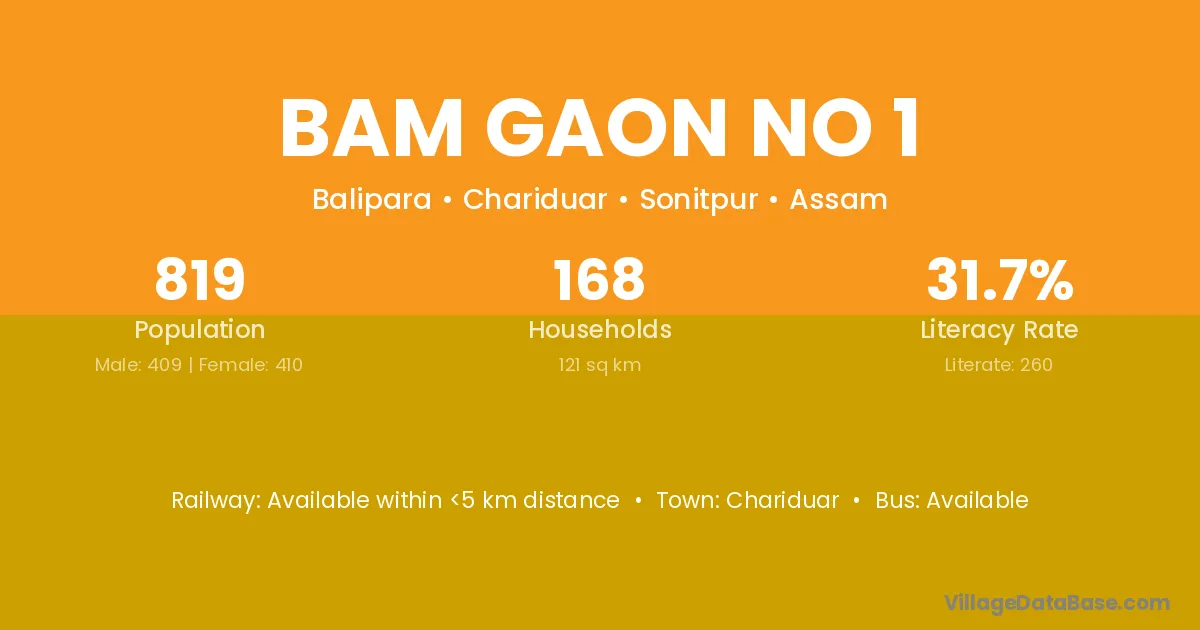 Bam Gaon No 1 village has a total population of 819 people, of which 409 are males and 410 are females.