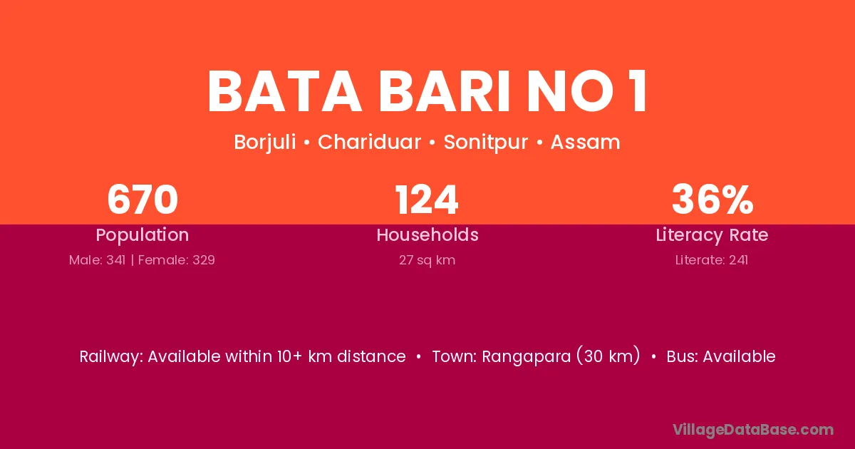 Rangapara (30 km) is the nearest town to Bata Bari No 1 village for major economic activities and is located approximately 30 km away.