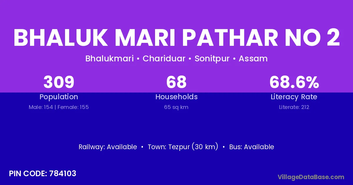 Tezpur (30 km) is the nearest town to Bhaluk Mari Pathar No 2 village for major economic activities and is located approximately 30 km away.