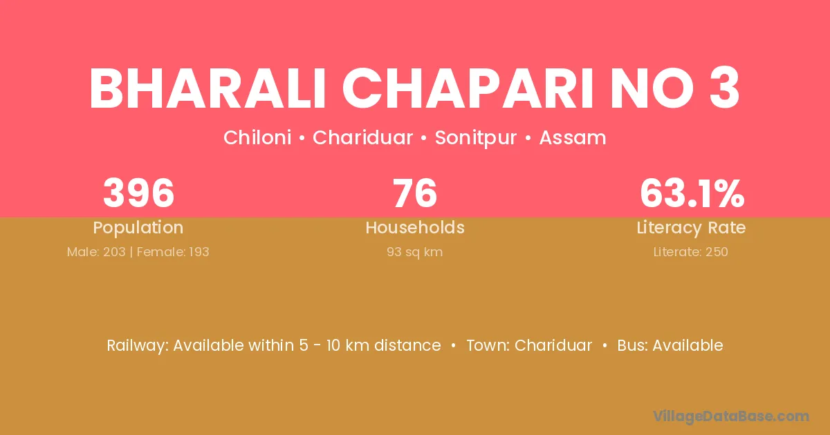 Bharali Chapari No 3 village has a total population of 396 people, of which 203 are males and 193 are females.