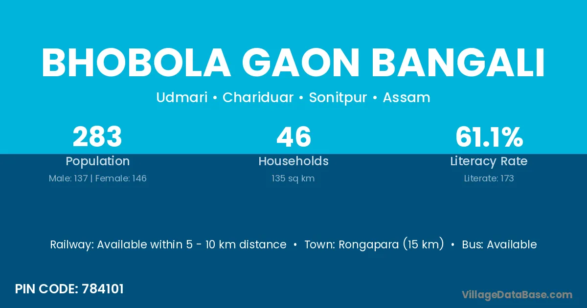 Bhobola Gaon Bangali village has a total population of 283 people, of which 137 are males and 146 are females.