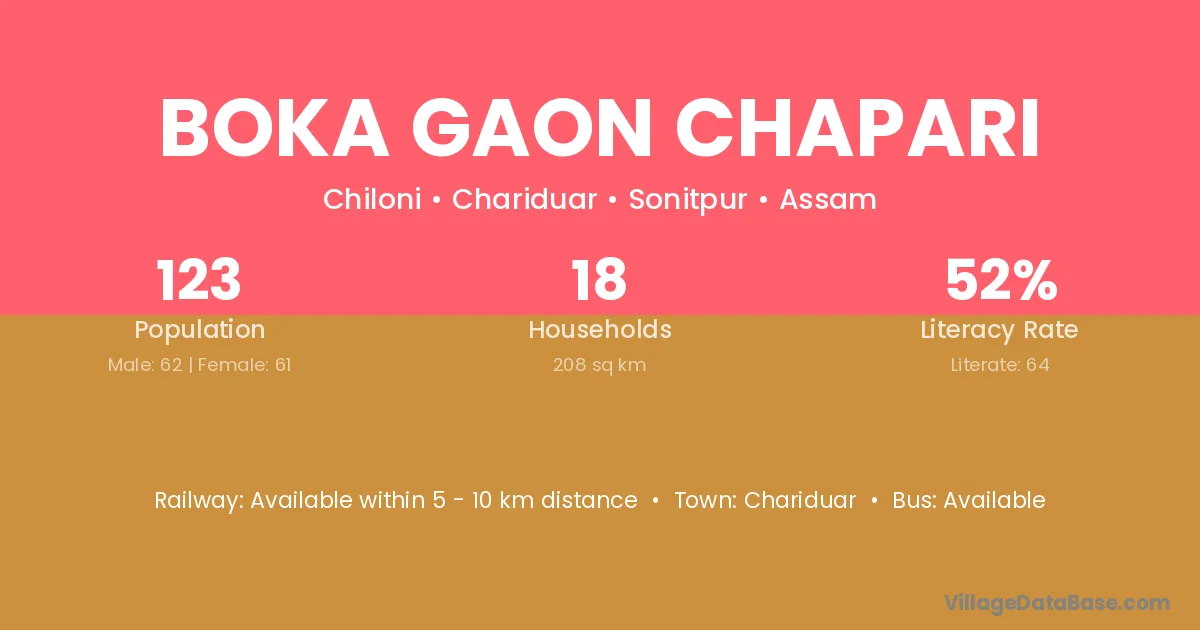 Boka Gaon Chapari village has a total population of 123 people, of which 62 are males and 61 are females.