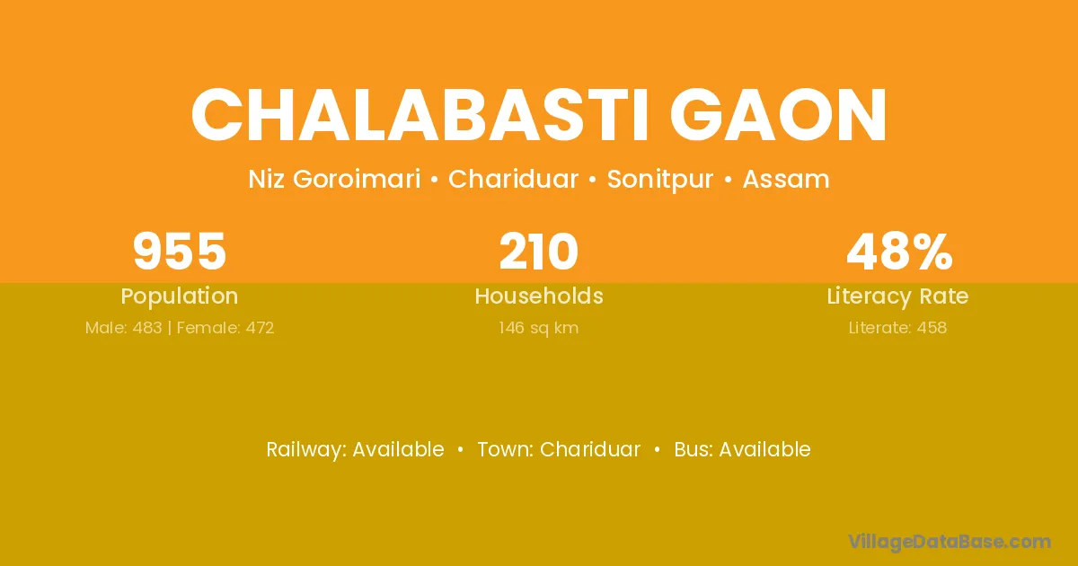 Chalabasti Gaon village has a total population of 955 people, of which 483 are males and 472 are females.