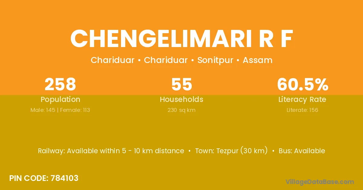 Tezpur (30 km) is the nearest town to Chengelimari R F village for major economic activities and is located approximately 30 km away.