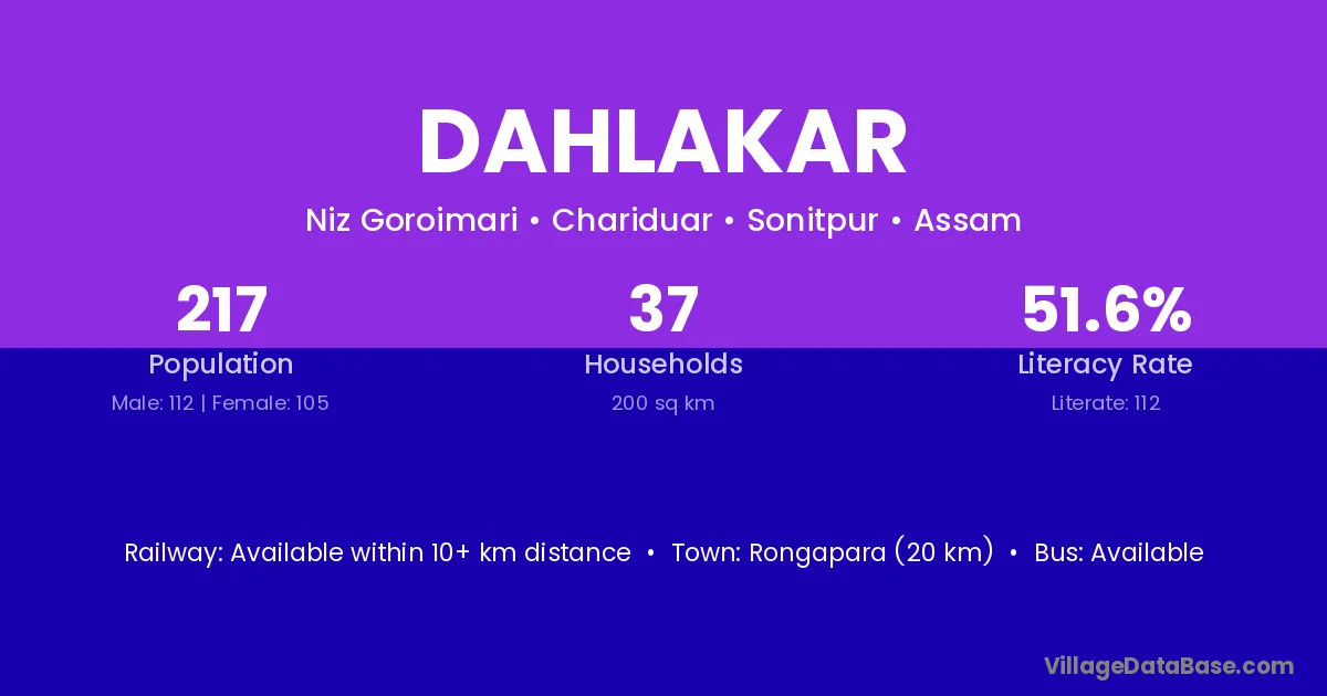 Rongapara (20 km) is the nearest town to Dahlakar village for major economic activities and is located approximately 20 km away.