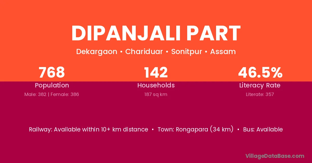 Rongapara (34 km) is the nearest town to Dipanjali Part village for major economic activities and is located approximately 34 km away.