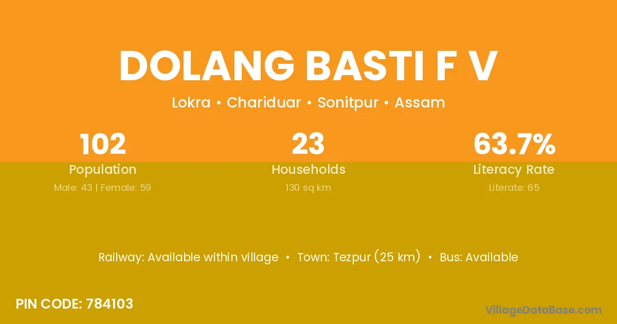 Tezpur (25 km) is the nearest town to Dolang Basti F V village for major economic activities and is located approximately 25 km away.