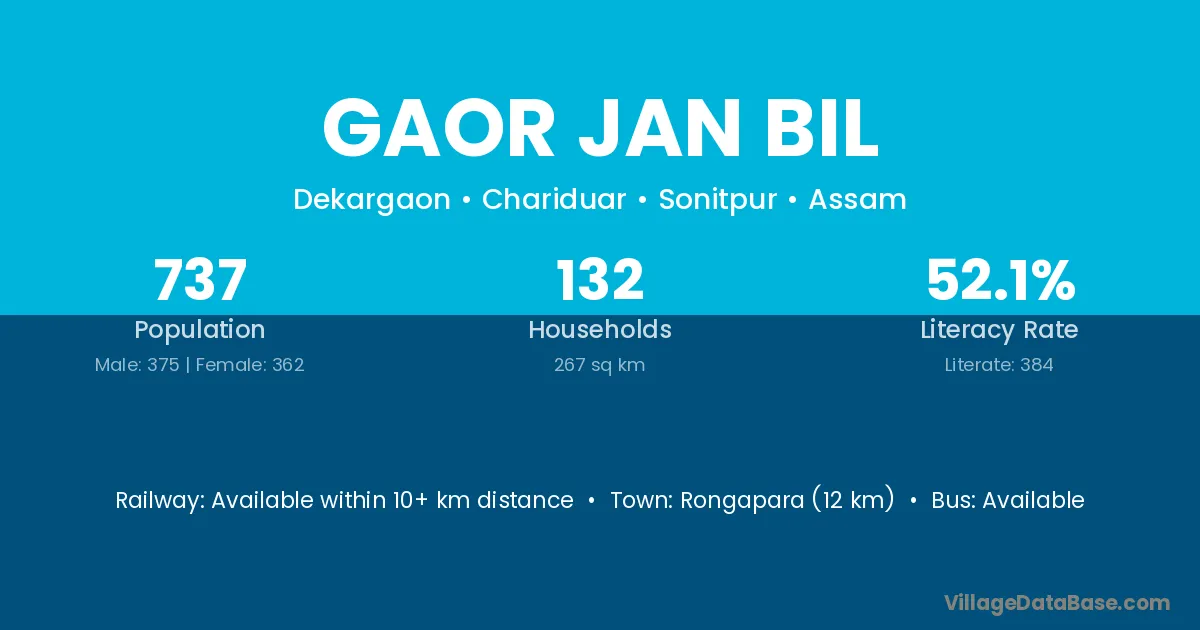 Rongapara (12 km) is the nearest town to Gaor Jan Bil village for major economic activities and is located approximately 12 km away.