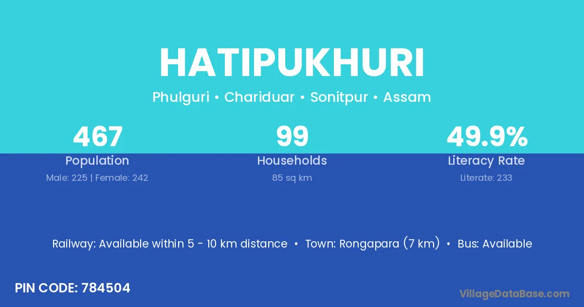 Hatipukhuri village has a total population of 467 people, of which 225 are males and 242 are females.