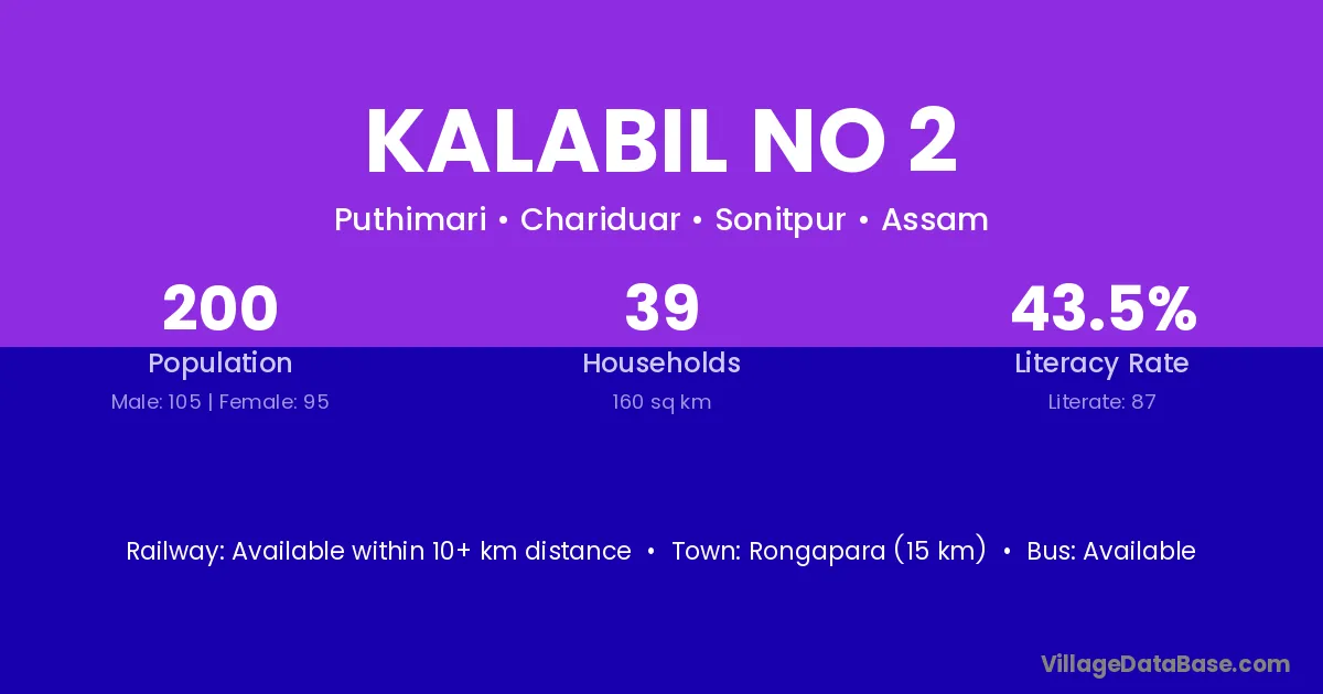 Rongapara (15 km) is the nearest town to Kalabil No 2 village for major economic activities and is located approximately 15 km away.