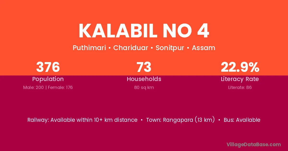 Rangapara (13 km) is the nearest town to Kalabil No 4 village for major economic activities and is located approximately 13 km away.